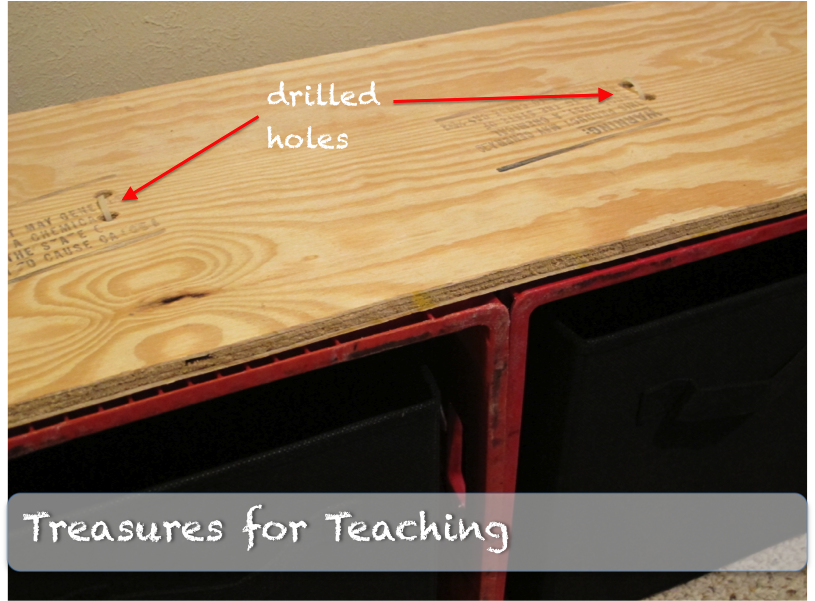 Then, I placed the wood on top of the crates to align places where holes could be drilled so that it could be attached without showing through the fabric...in other words, so it could stay pretty.